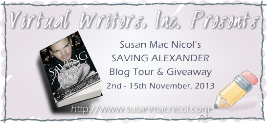 We have much pleasure in announcing the Saving Alexander Virtual Book Tour, beginning Saturday 2nd November and continuing through to midnight on Friday 15th November, 2013. Susan’s newest novel Saving Alexander is a m/m romance and was published on 29th October.
